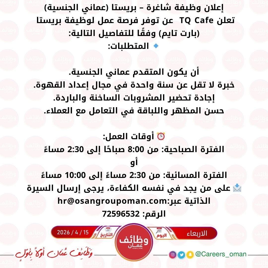 كافية TQ Cafe في غلا الصناعية - وظيفة شاغرة ( باريستا )