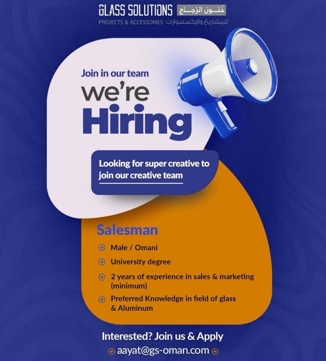 شركة حلول الزجاج للمشاريع والاكسسوارات - وظيفة شاغرة ( Salesman )