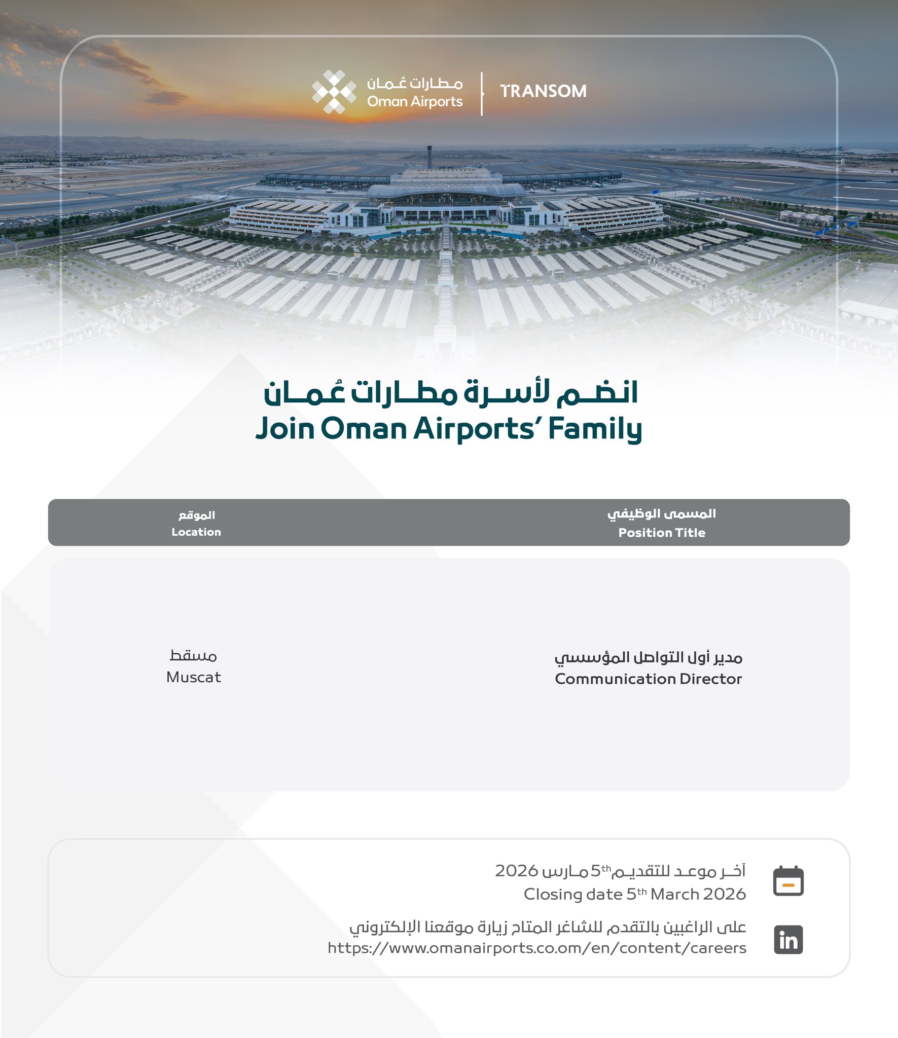 مطارات عُمان - وظيفة شاغرة ( مدير أول التواصل المؤسسي )