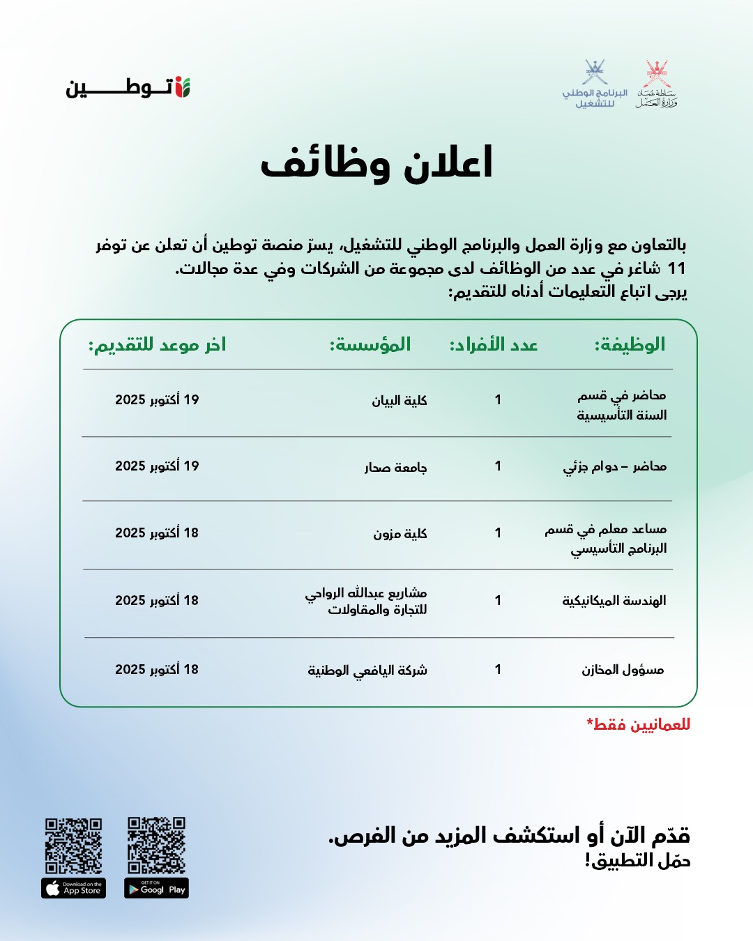 منصة توطين - 11 وظائف شاغرة لدى مجموعة من الشركات وفي عدة مجالات