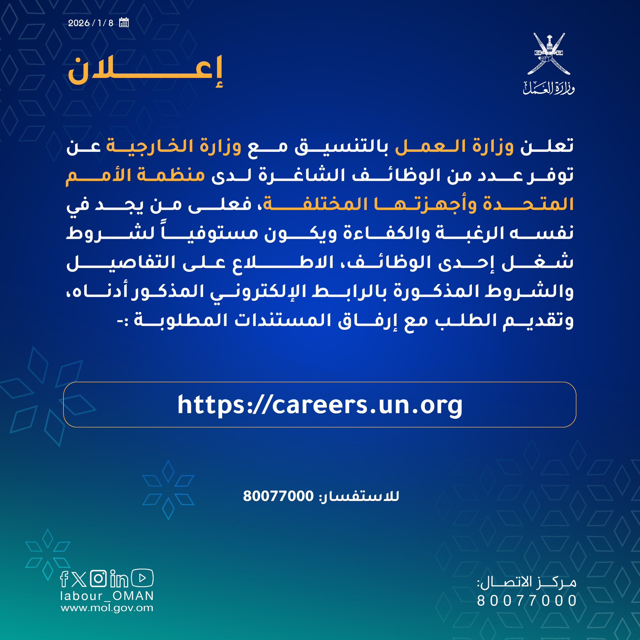 وزارة العمل بالتنسيق مع وزارة الخارجية - توفر عدد من الوظائف الشاغرة لدى منظمة الأمم المتحدة وأجهزتها المختلفة