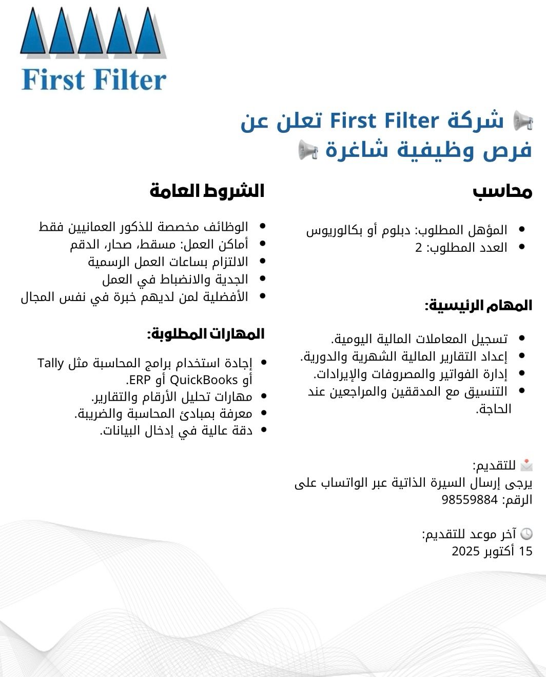 شركة First Filter - توفر عدد من الفرص الوظيفية في فروعها مسقط وصحار والدقم