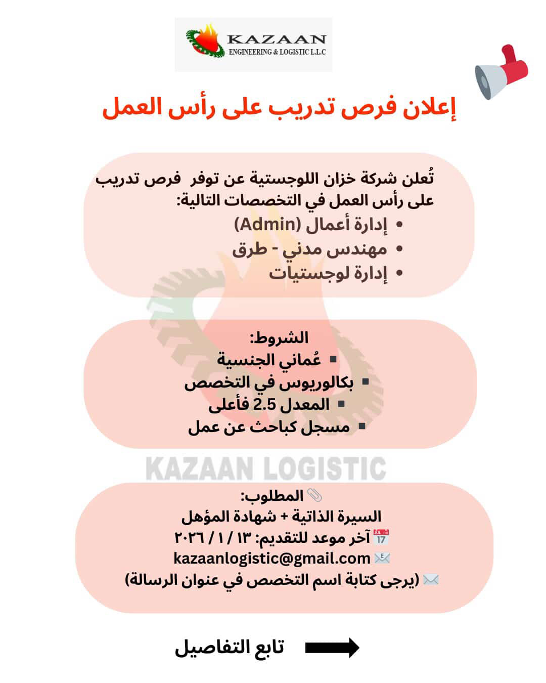 شركة خزان اللوجستية - توفر فرص تدريب على رأس العمل في مختلف التخصصات ( إدارة أعمال + مهندس مدني - طرق + إدارة لوجستيات )