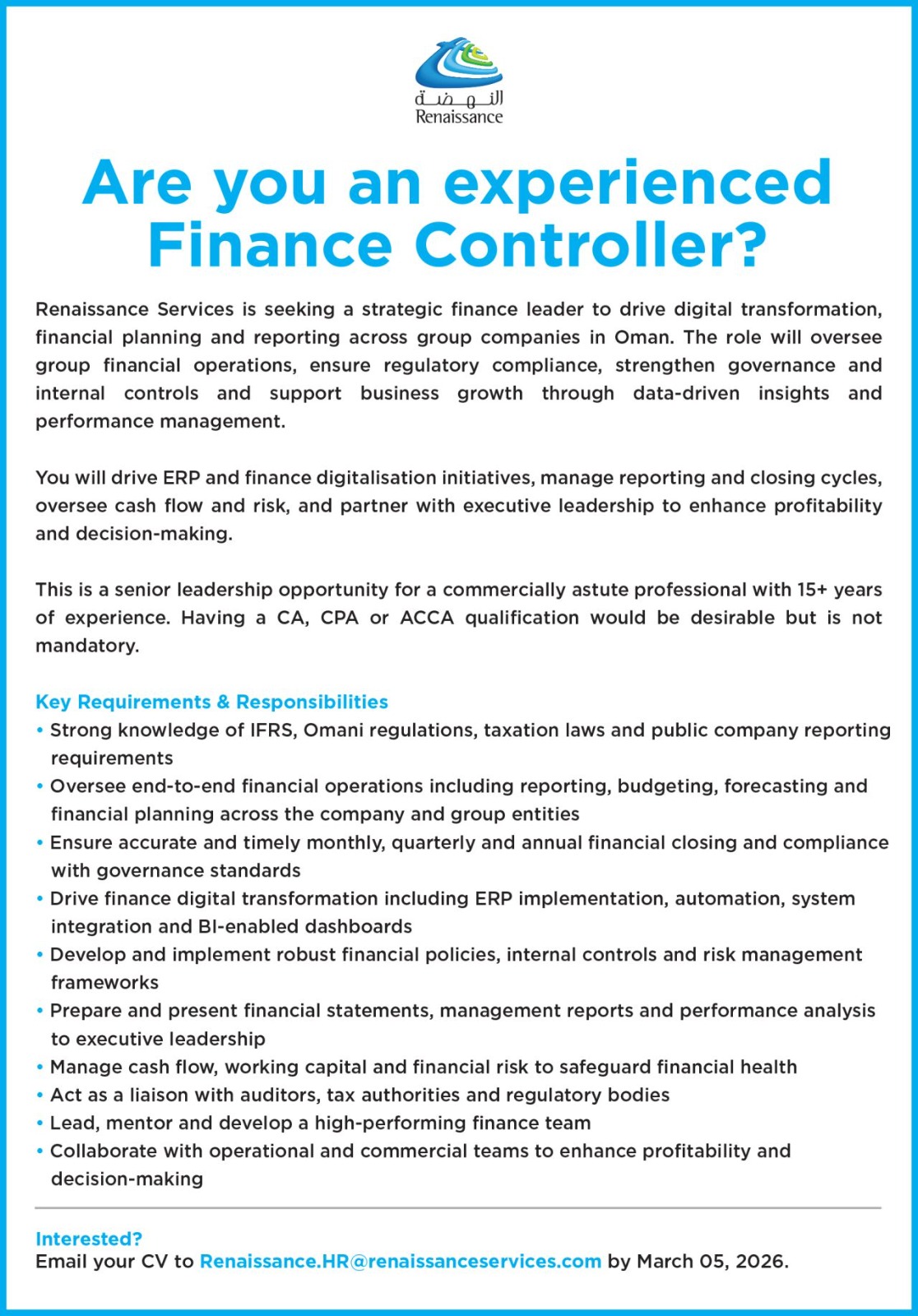 شركة النهضة للخدمات - وظيفة شاغرة ( Finance Controller )