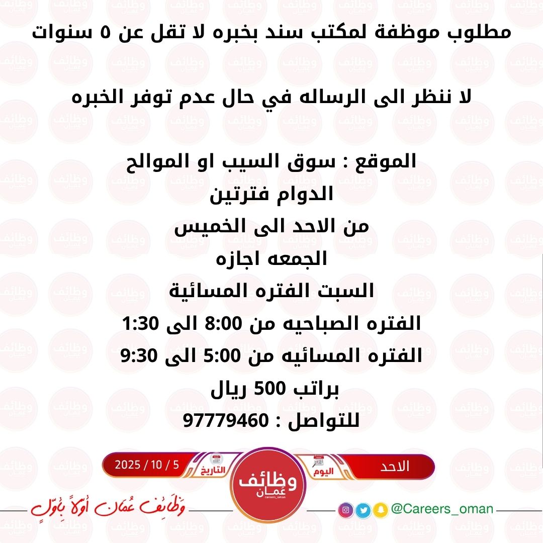 مكتب سند للخدمات في السيب - وظيفة شاغرة ( موظفة )
