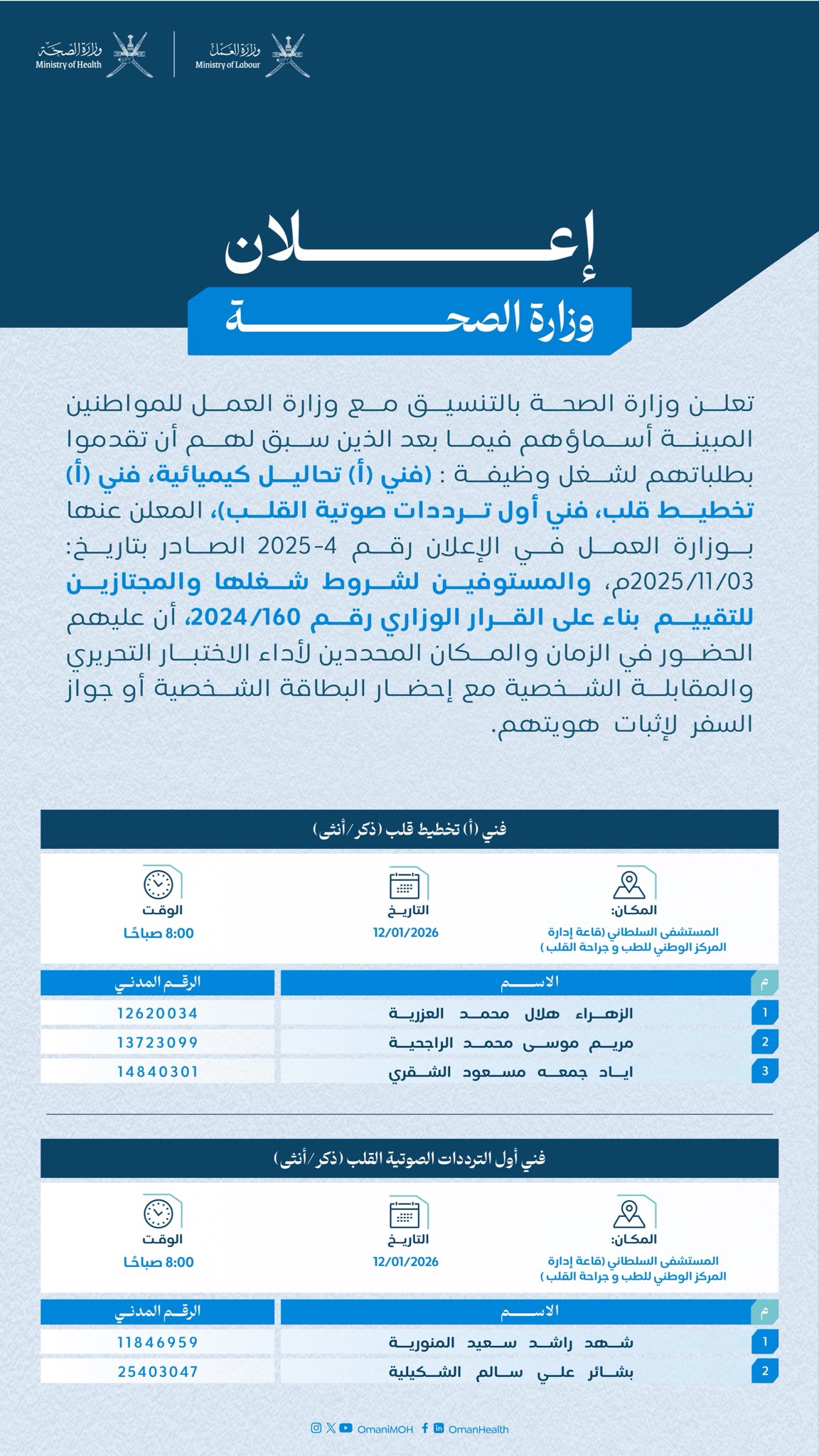 وزارة الصحة - اسماء المترشحين لأداء الاختبار التحريري والمقابلة الشخصية لشغل الوظائف (فني(أ) تحاليل كيميائية، فني(أ) تخطيط قلب، فني أول ترددات صوتية القلب)