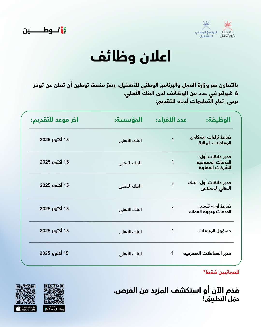 منصة توطين - 6 شواغر في عدد من الوظائف لدى البنك الأهلي