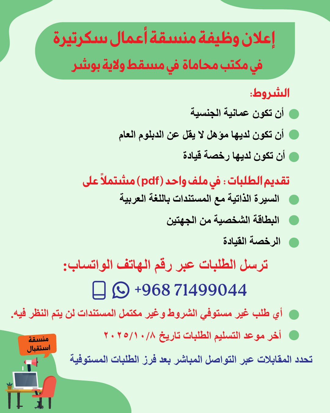 مكتب محاماة في ولاية بوشر - وظيفة شاغرة ( منسقة أعمال سكرتيرة )