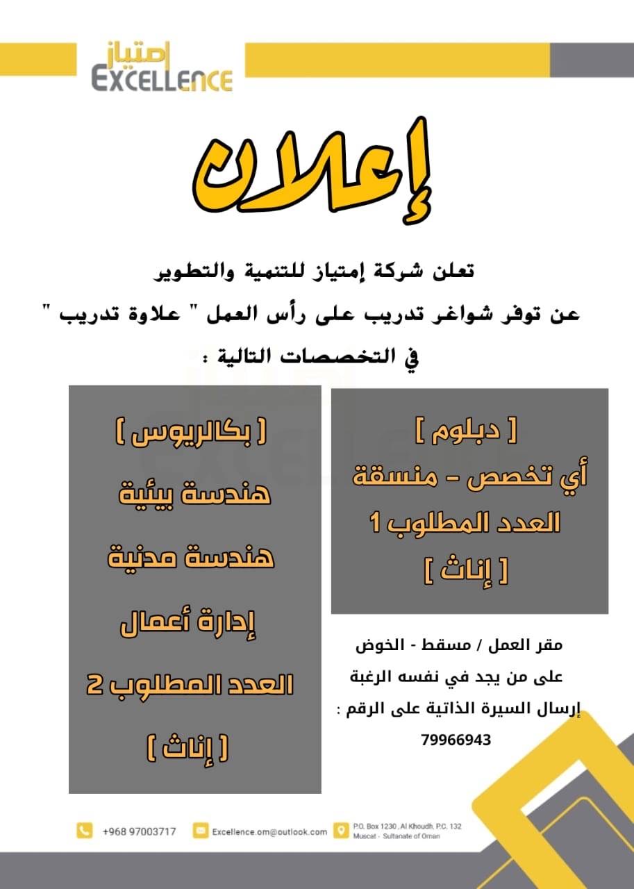 شركة إمتياز للتنمية والتطوير في الخوض - توفر شواغر تدريب على رأس العمل " علاوة تدريب " في مختلف التخصصات