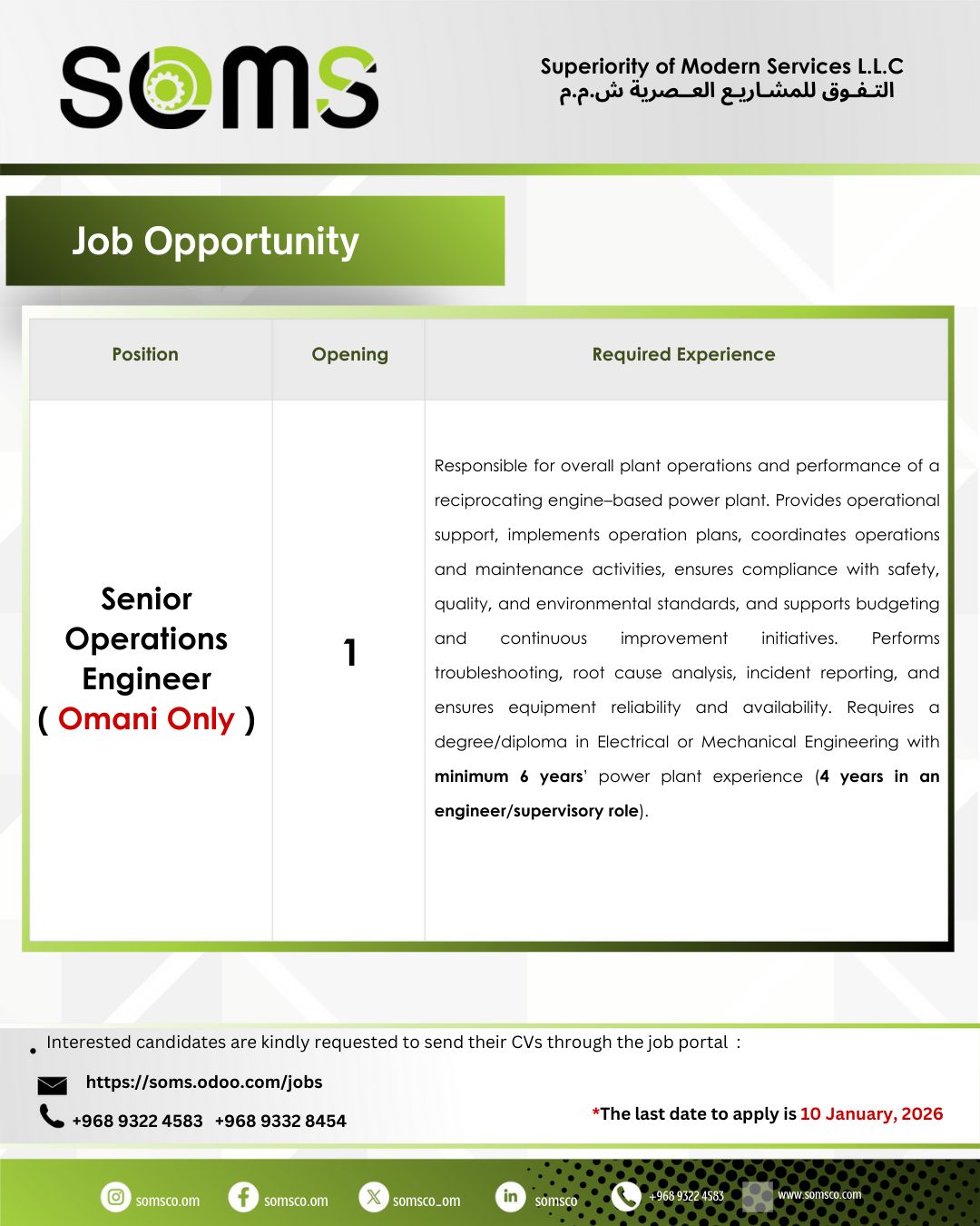 شركة التفوق للمشاريع العصرية - وظيفة شاغرة ( Senior Operations Engineer )