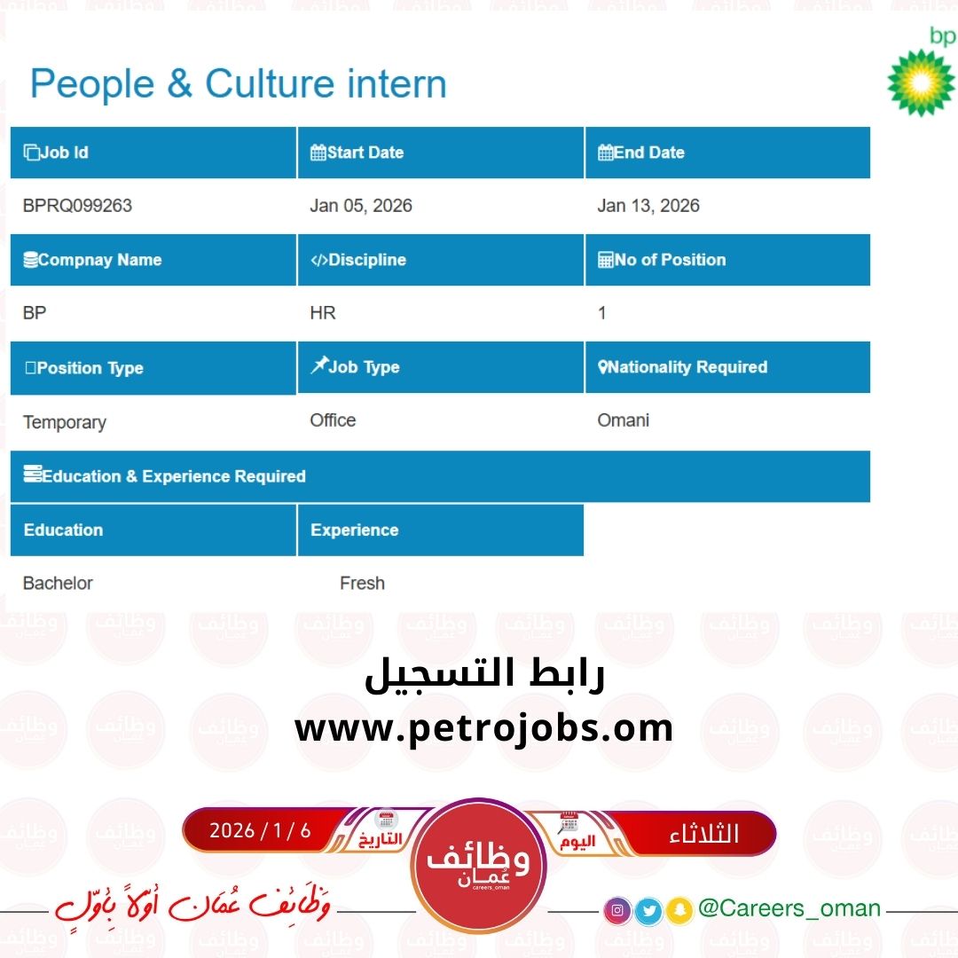 شركة بي بي عمان - وظيفة شاغرة ( People & Culture intern )