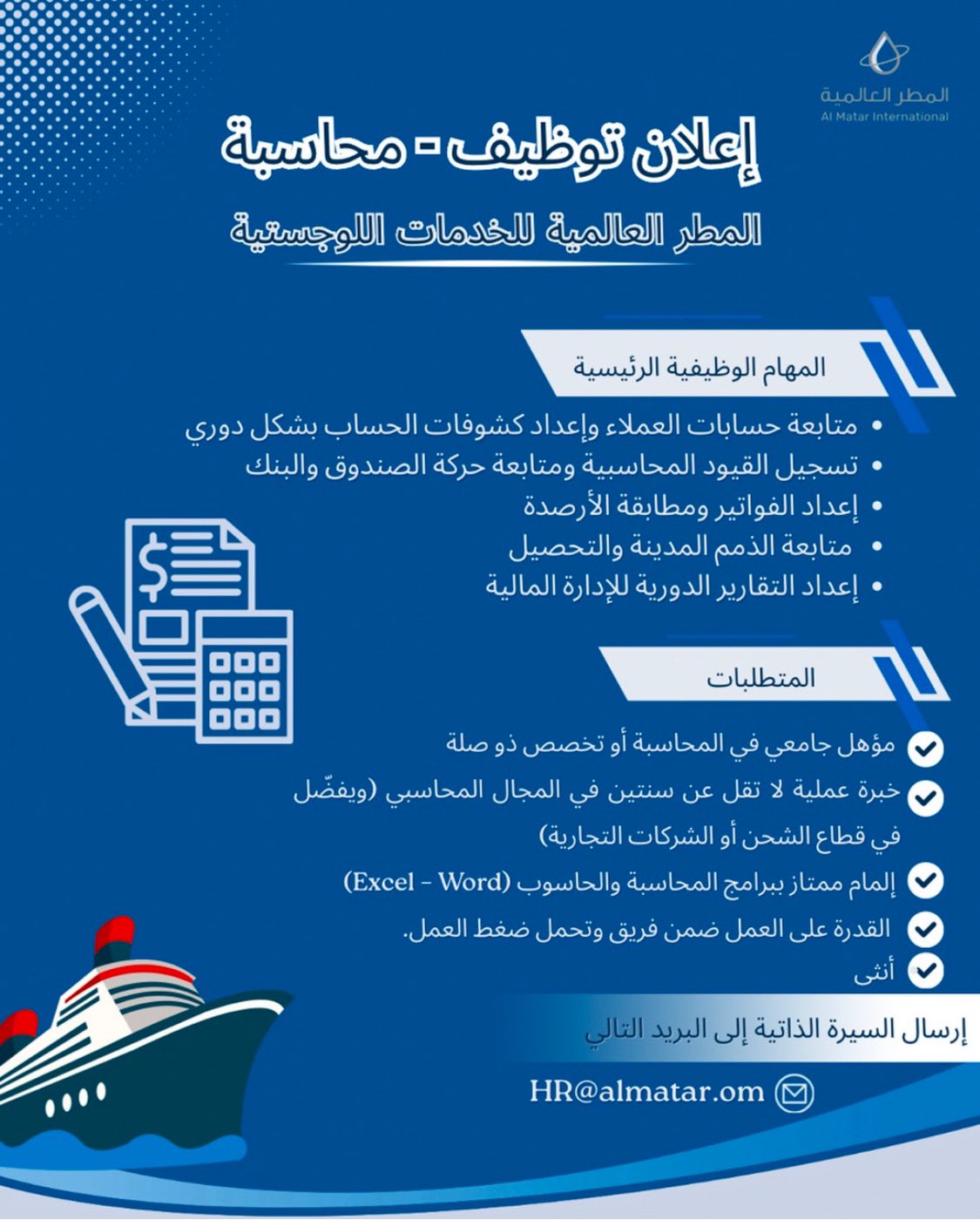 المطر العالمية للخدمات اللوجستية - وظيفة شاغرة ( محاسبة )