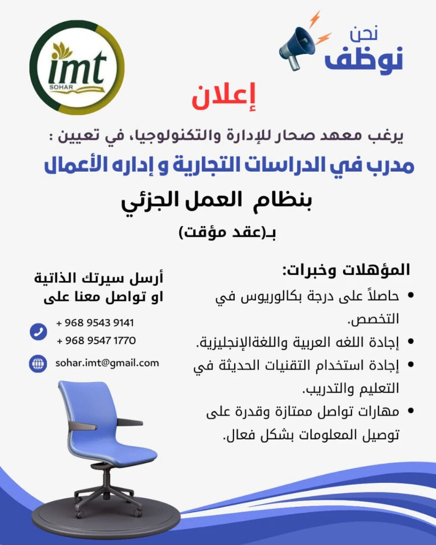 معهد صحار للإدارة والتكنولوجيا - وظيفة شاغرة بنظام العمل الجزئي ( مدرب في الدراسات التجارية و إداره الأعمال )
