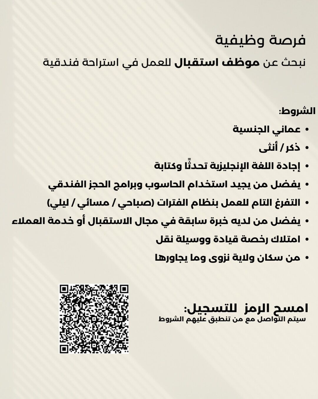 استراحة فندقية في نزوى - فرص وظيفية ( خدمة ومرتب غرف + موظف استقبال )