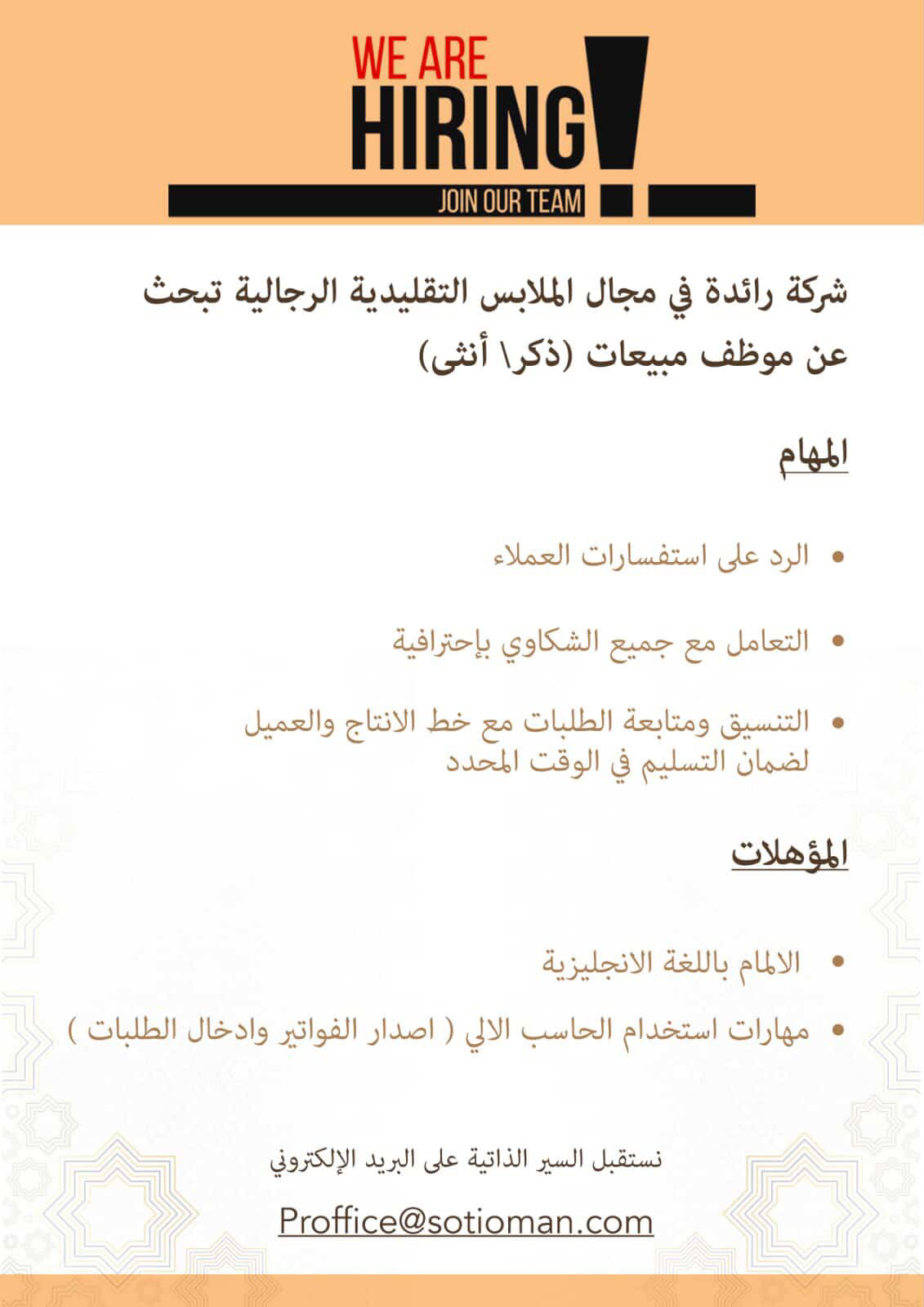 شركة رائدة في مجال الملابس التقليدية الرجالية - وظيفة شاغرة ( موظف مبيعات )