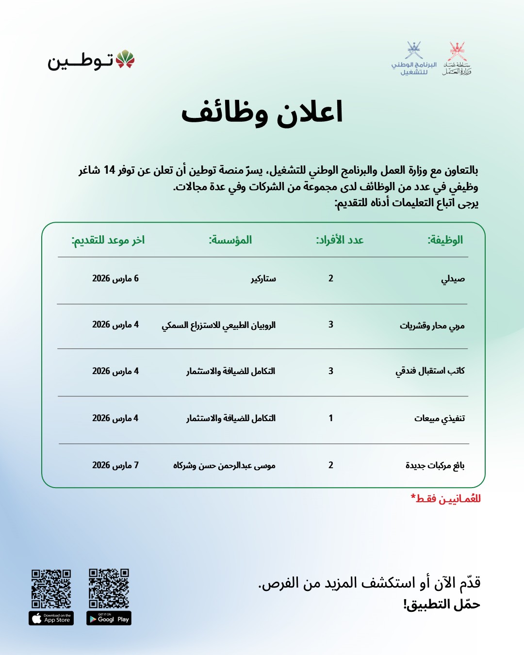 منصة توطين - توفر 14 شاغر وظيفي لدى مجموعة من الشركات وفي عدة مجالات