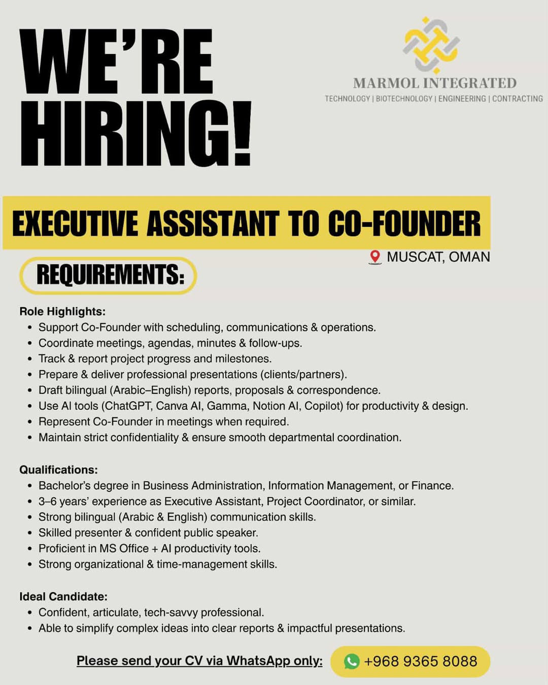 شركة مرمول المتكاملة في مسقط - وظيفة شاغرة ( EXECUTIVE ASSISTANT TO CO-FOUNDER )