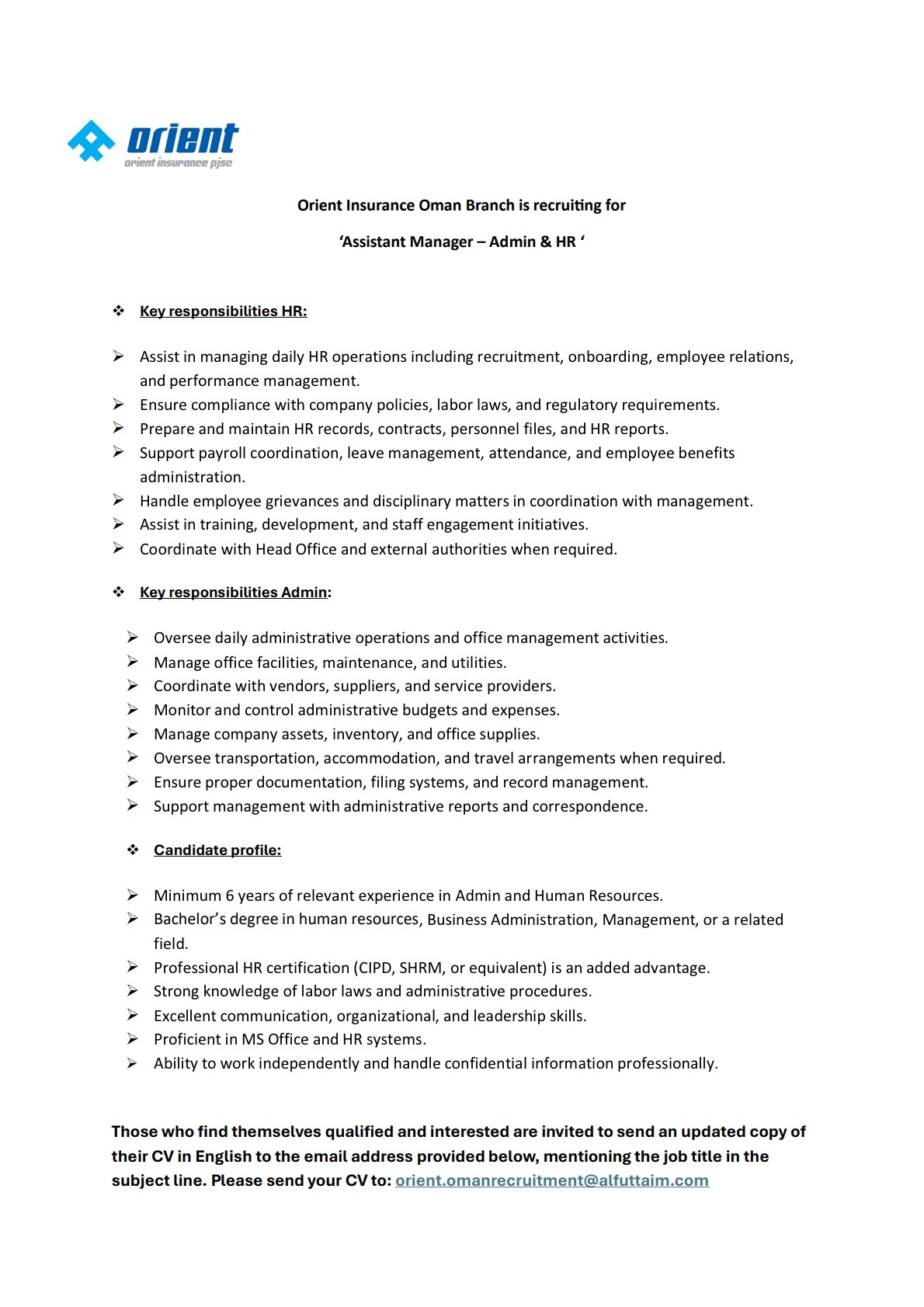 شركة أورينت للتأمين - وظيفة شاغرة ( Assistant Manager - Admin & HR )