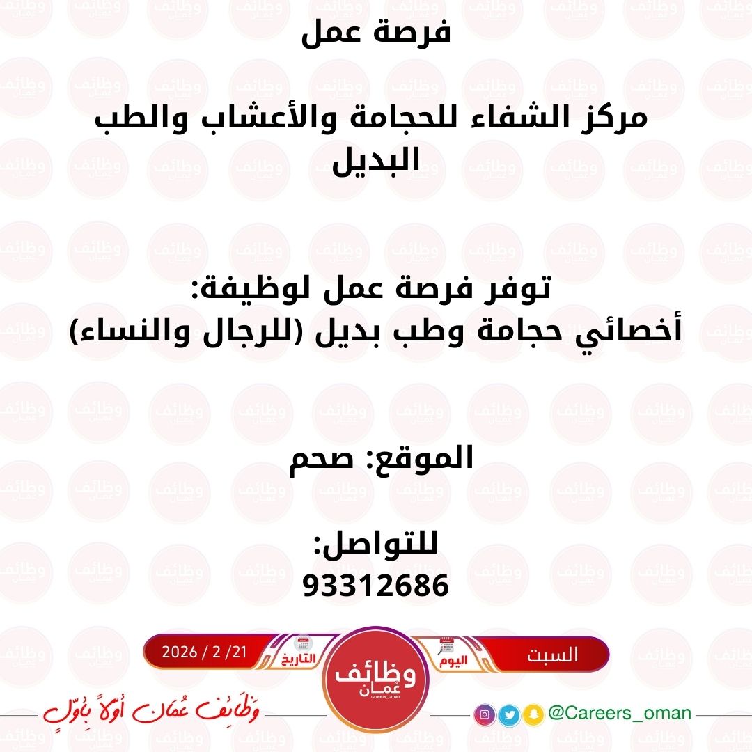 مركز الشفاء للحجامة والأعشاب والطب البديل في صحم - وظيفة شاغرة ( أخصائي حجامة وطب بديل )