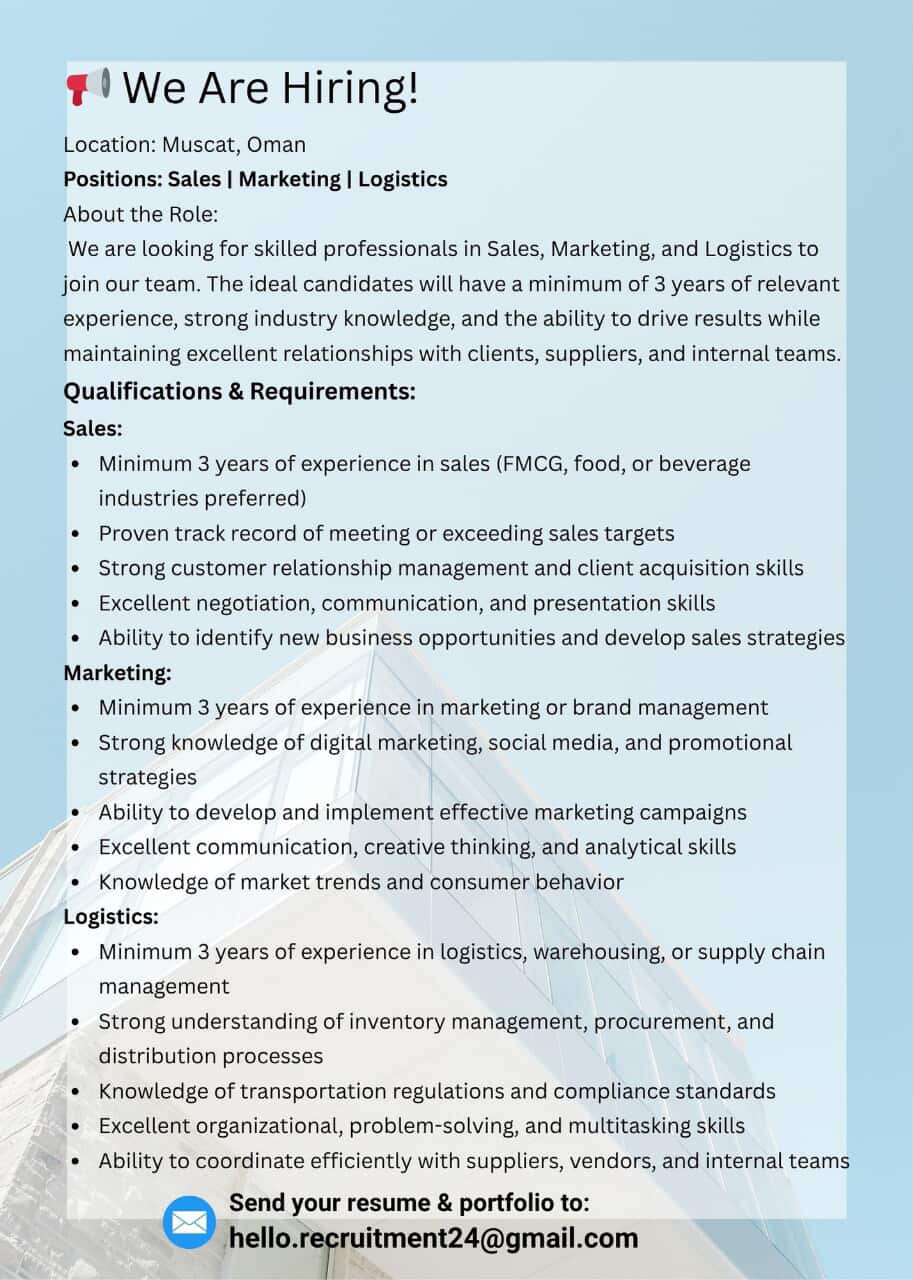 شركة رائدة في مسقط - فرص شاغرة ( Sales + Marketing + Logistics )