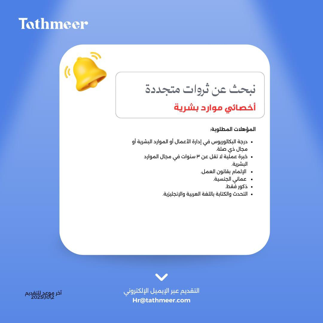 شركة تثمير العقارية - وظيفة شاغرة ( أخصائي موارد بشرية )