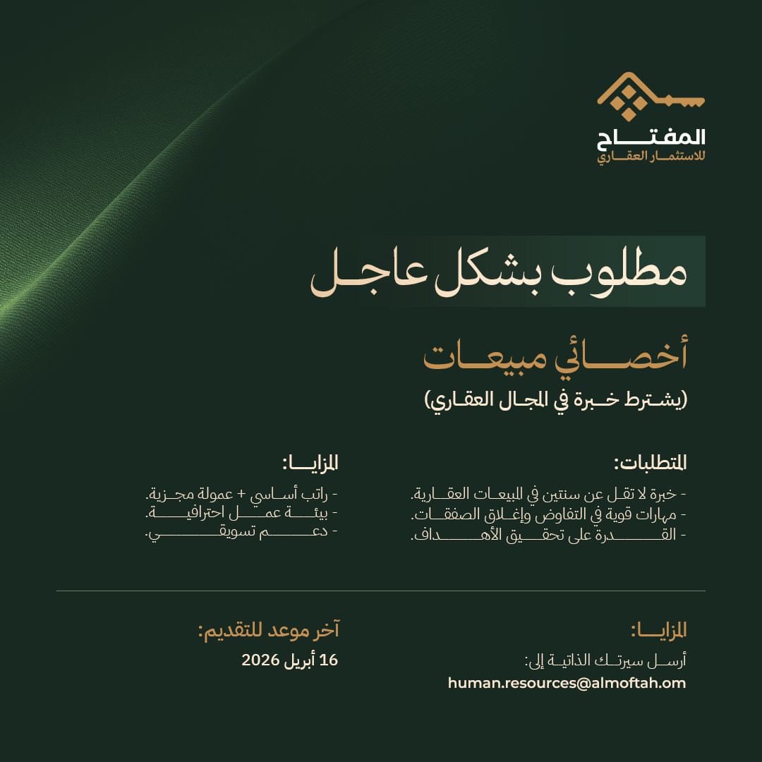شركة المفتاح للاستثمار العقاري - وظيفة شاغرة ( أخصائي مبيعات )
