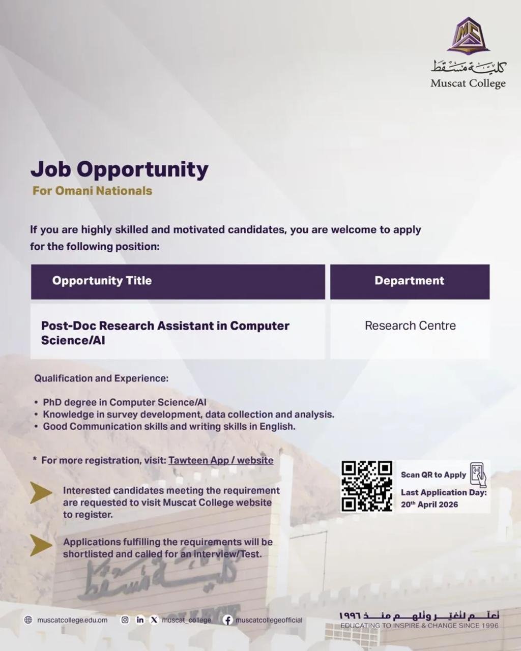 كلية مسقط - وظيفة شاغرة ( مساعد باحث ما بعد الدكتوراه في علوم الحاسب / الذكاء الاصطناعي )