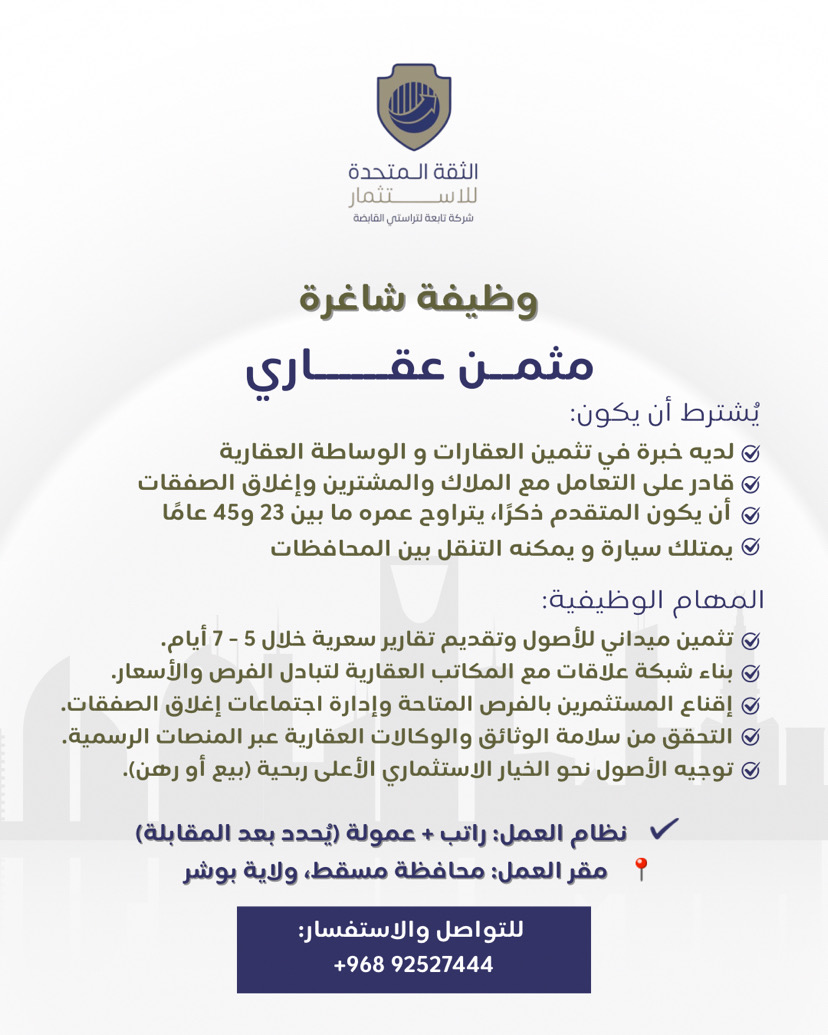 شركة الثقة المتحدة للاستثمار في بوشر - وظيفة شاغرة ( مثمن عقاري )