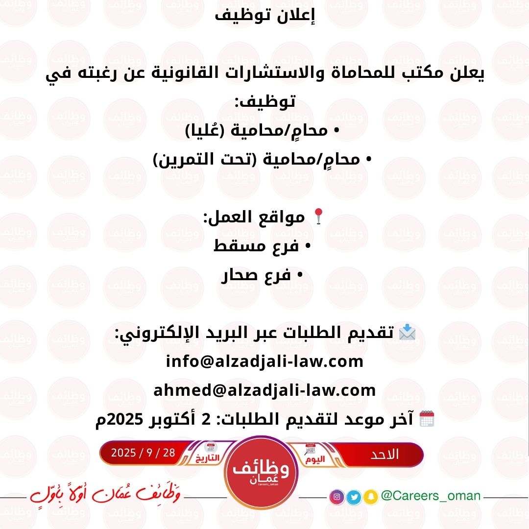 مكتب للمحاماة والاستشارات القانونية فرع مسقط وصحار - وظائف شاغرة ( محامٍ/محامية (عُليا) + محامٍ/محامية (تحت التمرين)