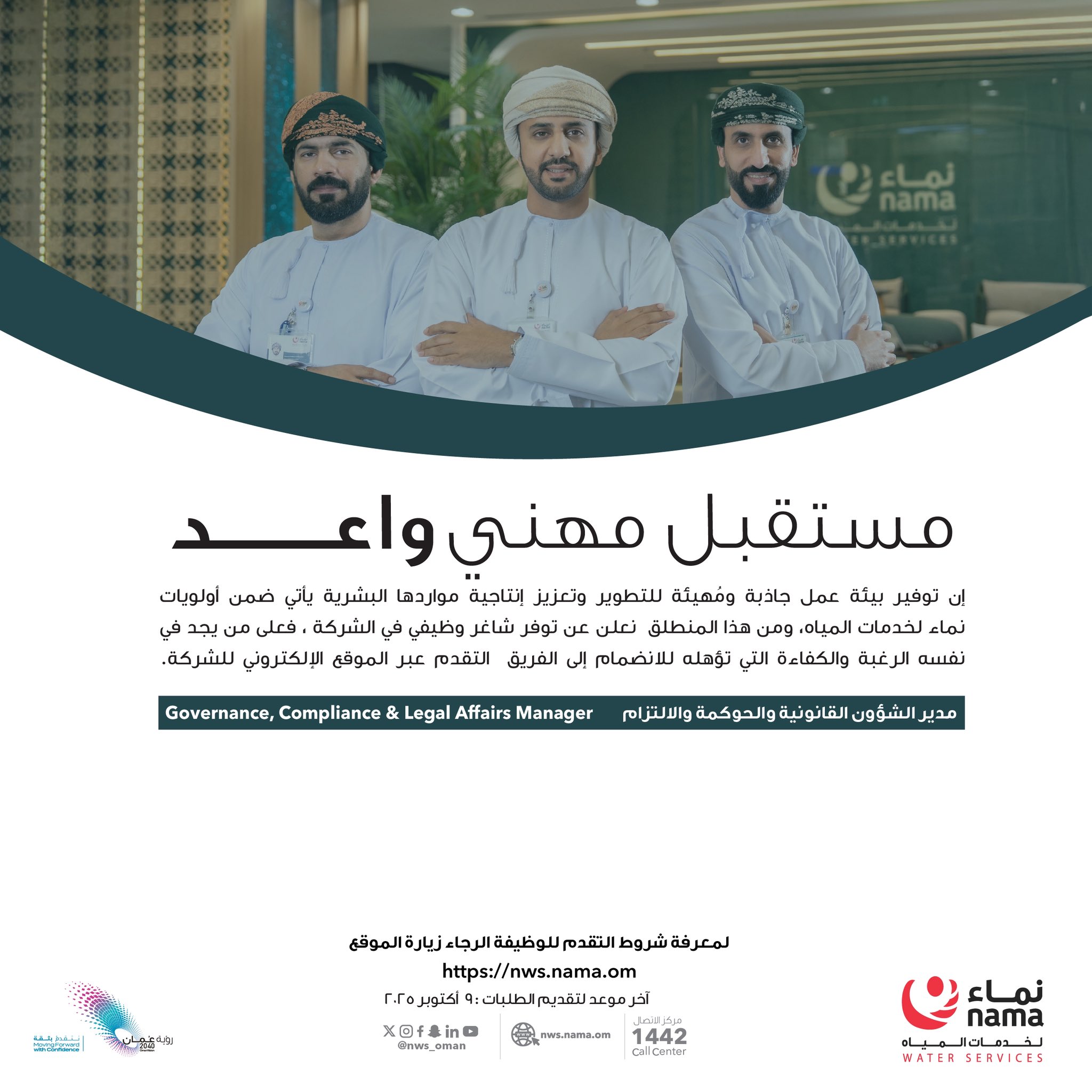 شركة نماء لخدمات المياه - وظيفة شاغرة ( مدير الشؤون القانونية والحوكمة والالتزام )