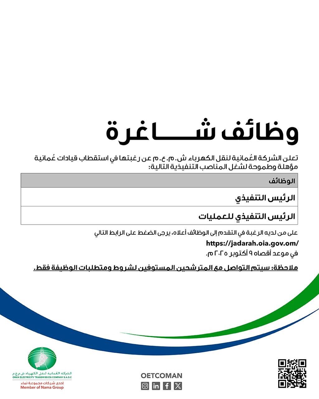 الشركة العمانية لنقل الكهرباء - وظيفتين شاغرتين ( الرئيس التنفيذي + الرئيس التنفيذي للعمليات )