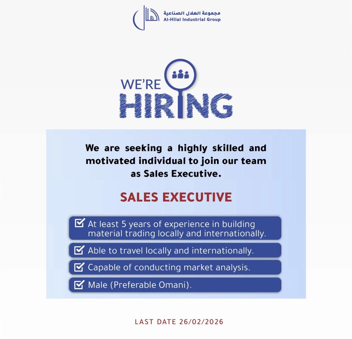 مجموعة الهلال الصناعية - وظيفة شاغرة ( SALES EXECUTIVE )