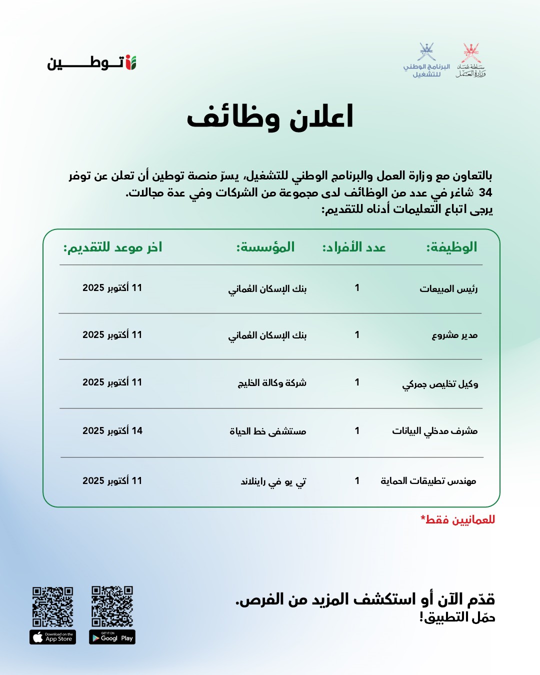 منصة توطين - 34 وظيفة شاغرة لدى مجموعة من الشركات وفي عدة مجالات