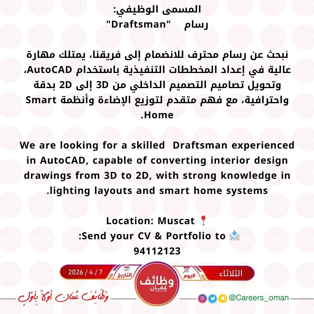 شركة رائدة في مسقط - توفر وظيفتين شاغرتين ( مصمم داخلي + رسام )