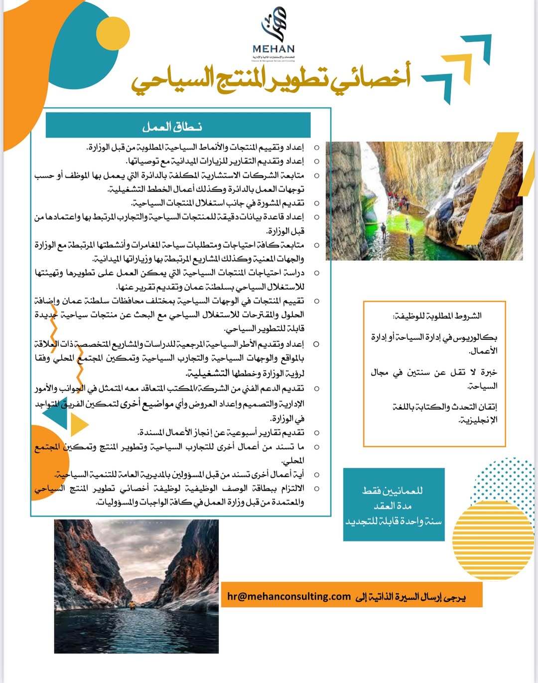 شركة مهن للاستشارات في مسقط - وظيفة شاغرة بعقد سنة ( أخصائي تطوير المنتج السياحي )