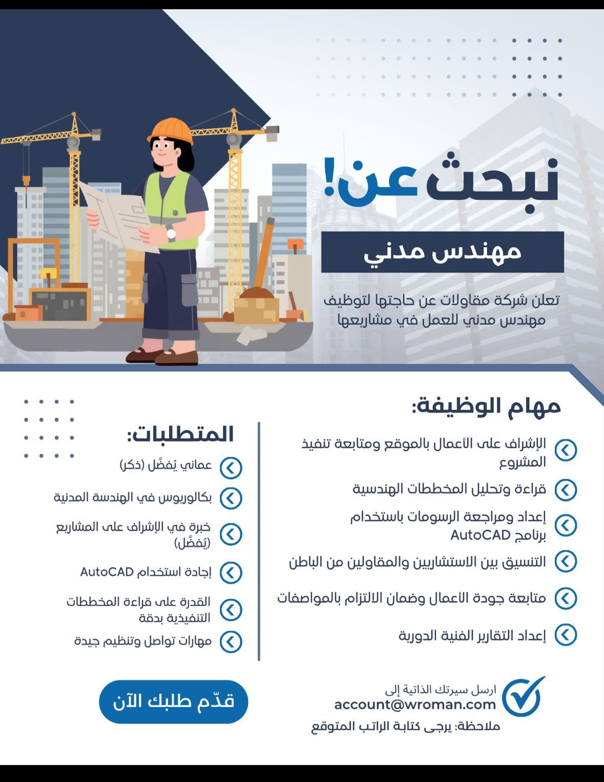 شركة مقاولات في مسقط - وظيفة شاغرة ( مهندس مدني )