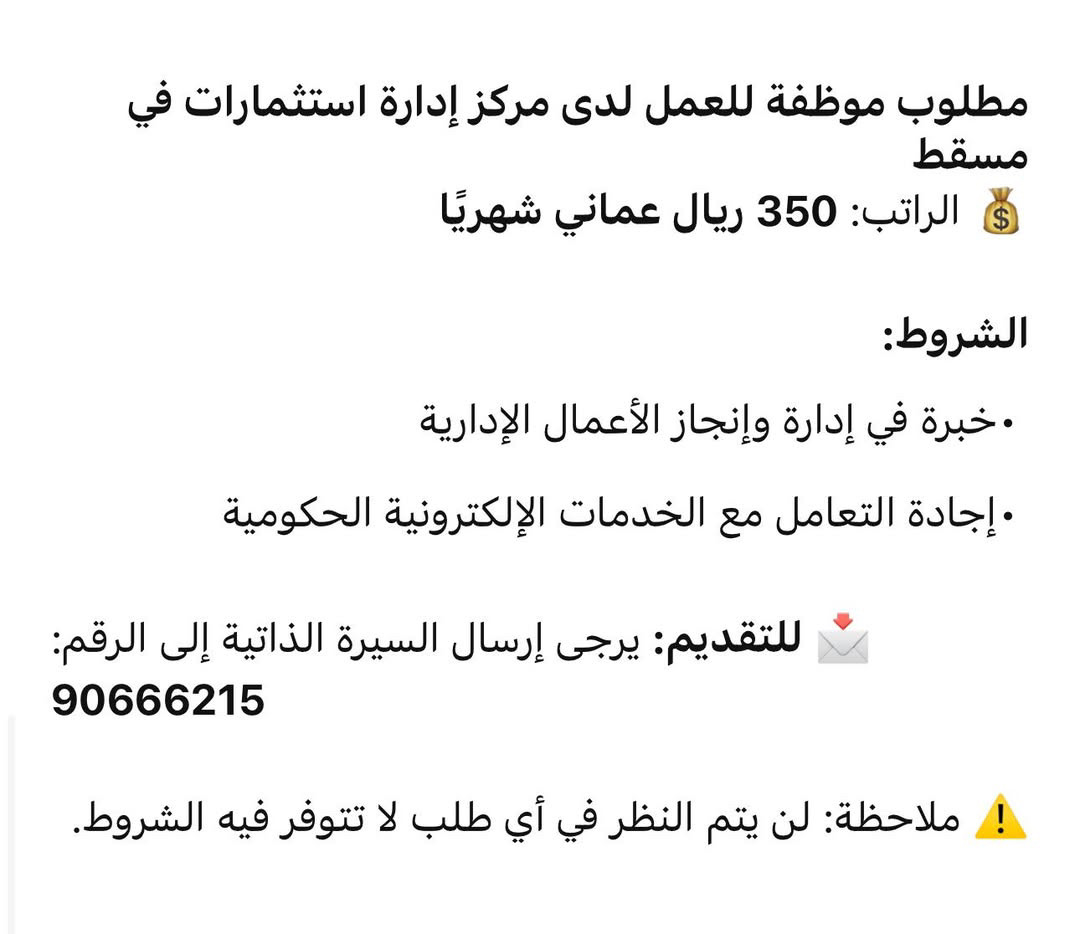 مركز إدارة استثمارات في مسقط - وظيفة شاغرة ( موظفة )