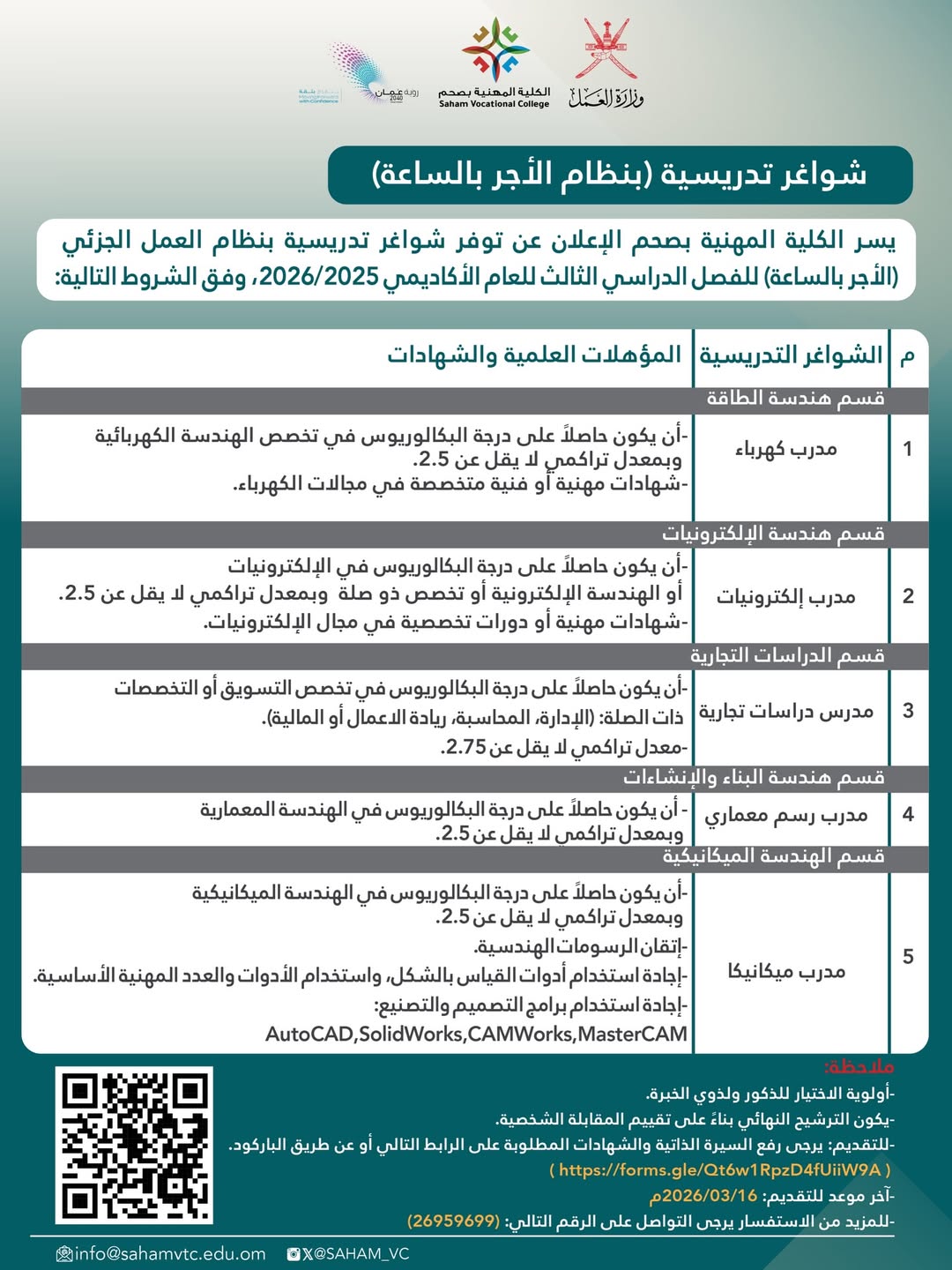 الكلية المهنية بصحم - شواغر تدريسية بنظام الأجر بالساعة