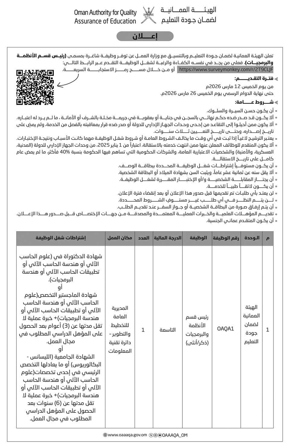الهيئة العمانية لضمان جودة التعليم - وظيفة شاغرة ( رئيس قسم الأنظمة والبرمجيات )