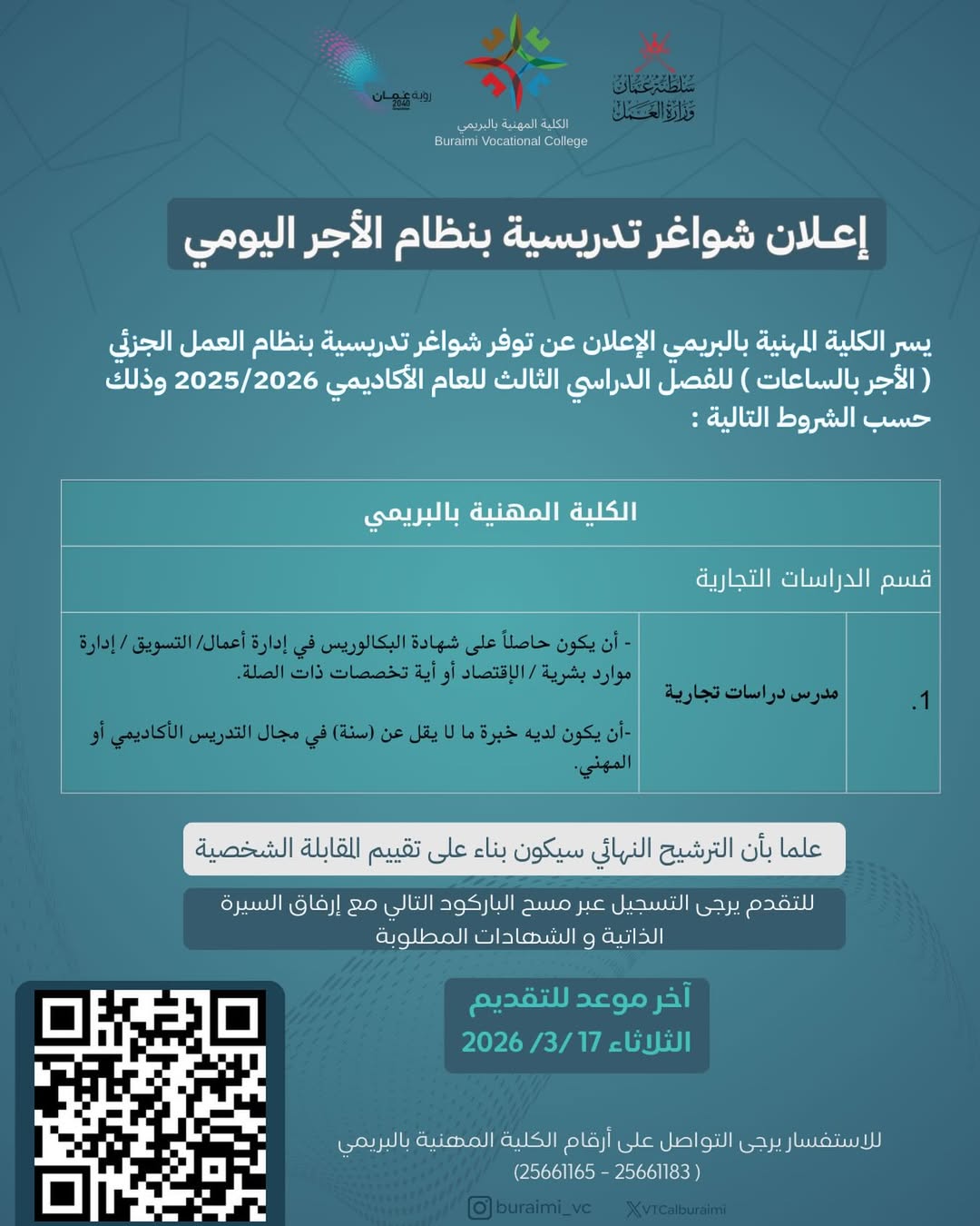 الكلية المهنية بالبريمي - شواغر تدريسية بنظام الأجر بالساعة