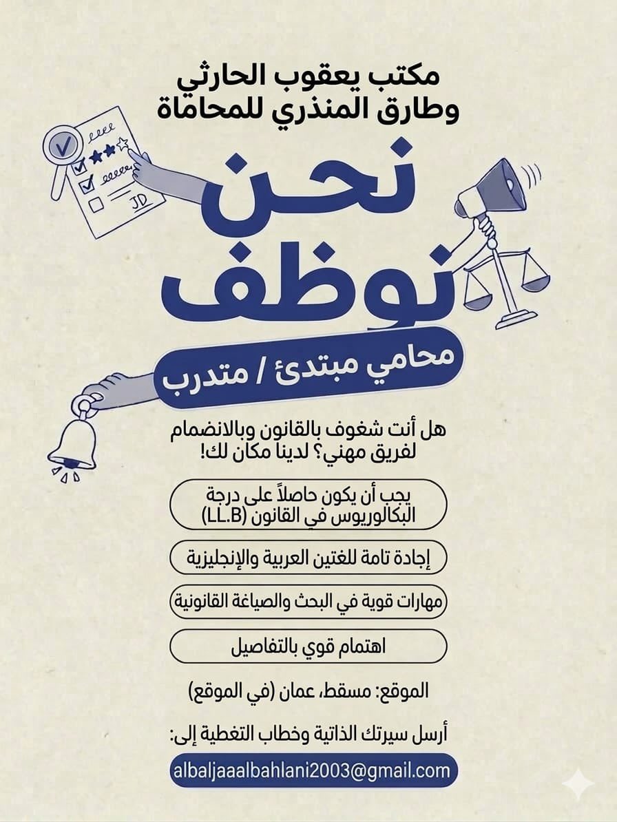 مكتب يعقوب الحارثي وطارق المنذري للمحاماة في مسقط - وظيفة شاغرة ( محامي مبتدئ / متدرب )
