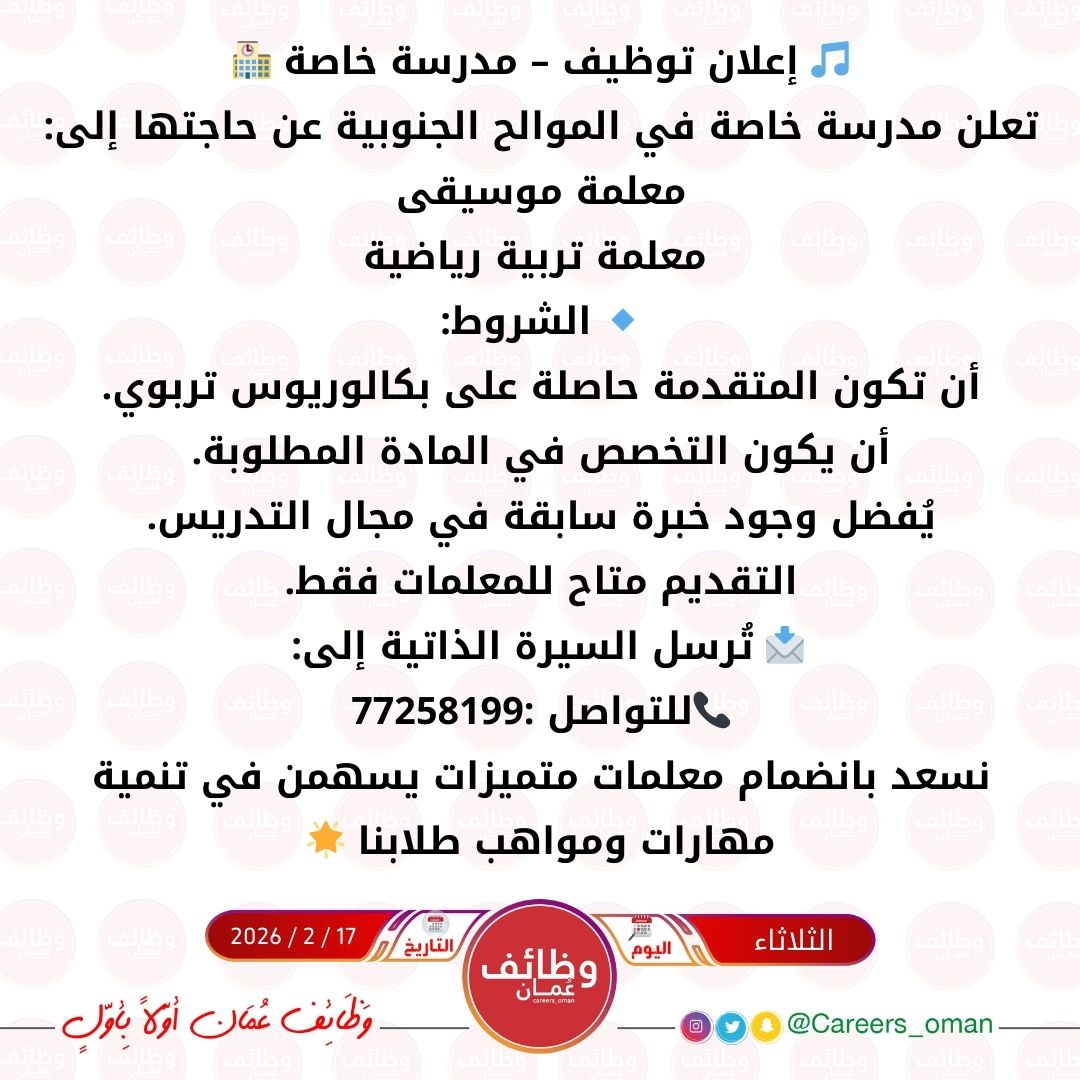 مدرسة خاصة في الموالح الجنوبية - فرص شاغرة ( معلمة موسيقى + معلمة تربية رياضية )