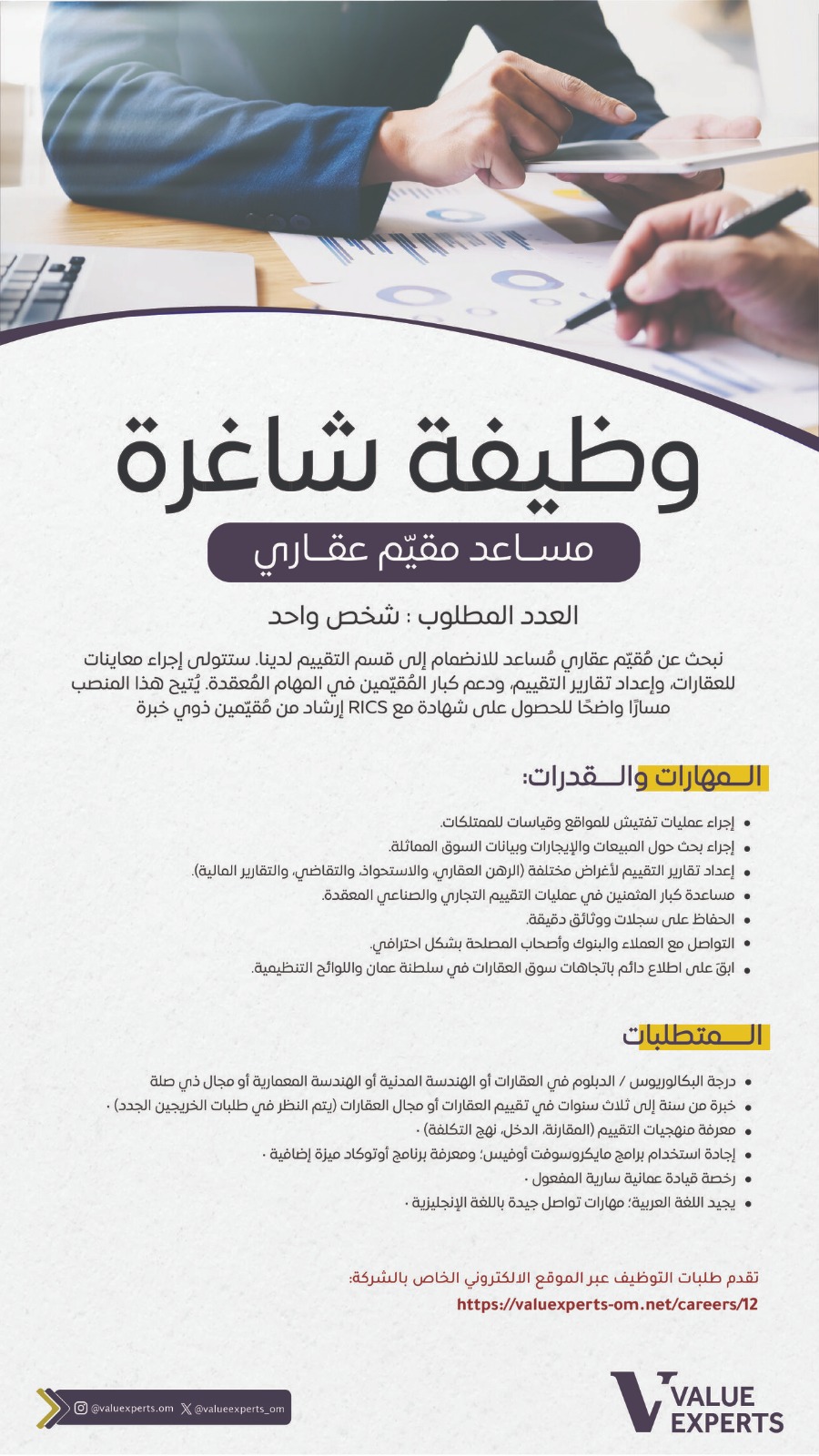 شركة خبراء القيمة - وظيفتين شاغرتين ( تنفيذي مبيعات + مساعد مقيّم عقاري )