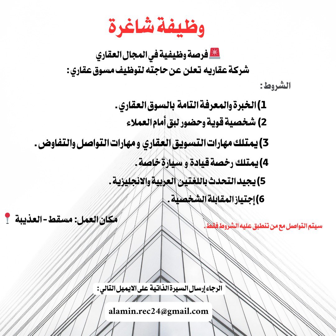 شركة رائدة في مجال العقاري في العذيبة - وظيفة شاغرة ( مسوق عقاري )