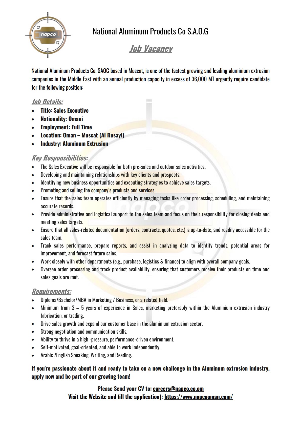الشركة الوطنية لمنتجات الألمنيوم في مسقط - وظيفة شاغرة ( Sales Executive )