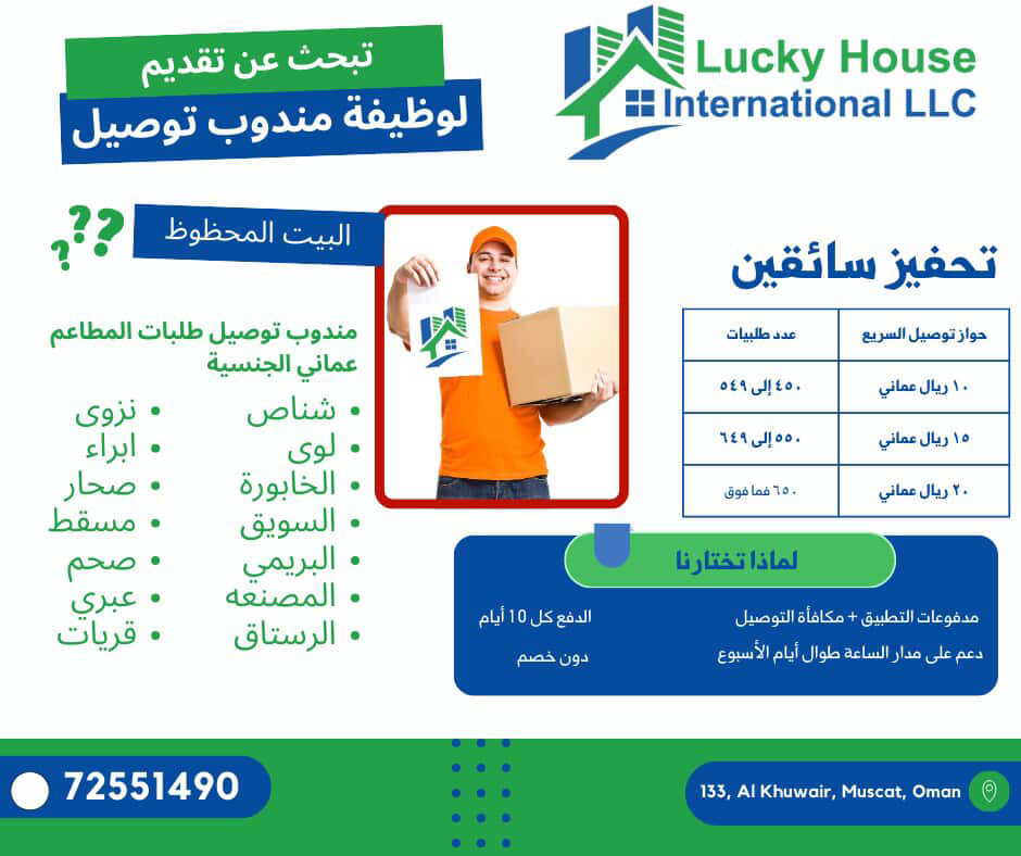 شركة البيت المحظوظ العالمية - توفر فرصة شاغرة ( مندوب توصيل في مختلف الولايات )