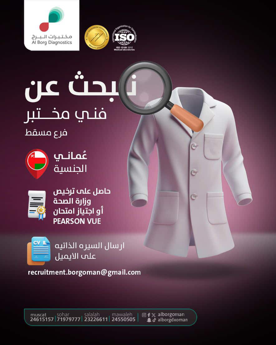 مختبرات البرج فرع مسقط - وظيفة شاغرة ( فني مختبر )