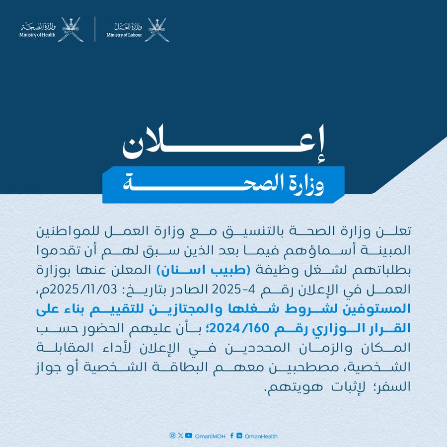 وزارة الصحة - اسماء المترشحين لأداء المقابلة الشخصية لشغل وظيفة (طبيب أسنان)