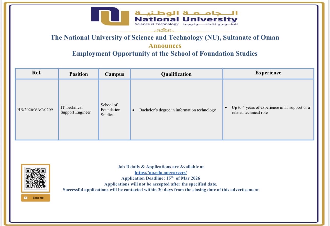 الجامعة الوطنية للعلوم والتكنولوجيا - وظيفة شاغرة ( IT Technical Support Engineer )