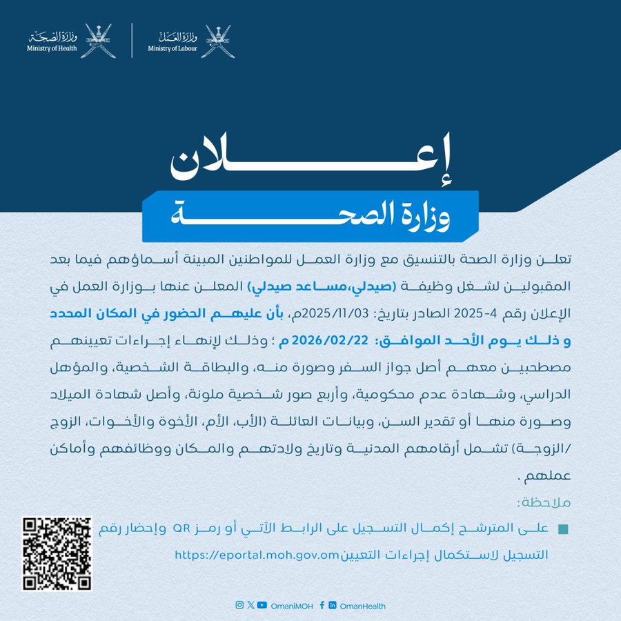 وزارة الصحة - إعلان أسماء المترشحين لاستكمال إجراءات التعيين لشغل وظيفة (صيدلي، مساعد صيدلي)